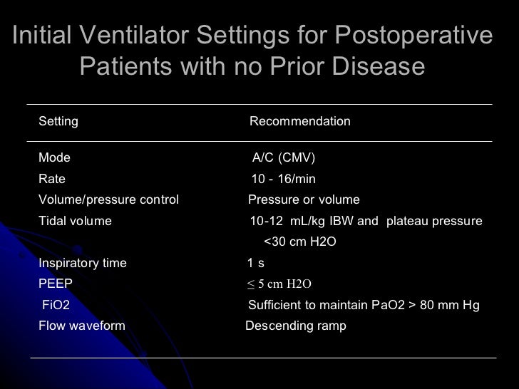 Tutorial tips: Mechanical ventilator protocol from NIH ... from image.slidesharecdn.com See separate chart incomplete exhalation & airway obstruction. Determining initial ventilator settings during volume ventilation. Ventilator settings chart keyword after analyzing the system lists the list of keywords related and the list of websites with related content, in addition you can see which keywords most interested. When the ventilator settings are confirmed, the mode settings menu closes, and the note: If the ventilator is turned off during ventilation, an alarm sounds, and ventilation and monitoring. Selecting the best ventilator hyperinflation settings based on. Primary goal of volume ventilation is the achieve a highest setting 3. Ventilator setup and adjustment 1.